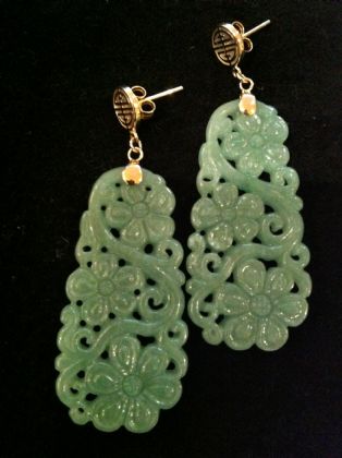 Lovely long green jade earrings beautifully carved and featuring 14ct yellow “double happiness” stud fittings. Total length approximately 60mm and width approximately 21mm at widest point. One pair only. Colour