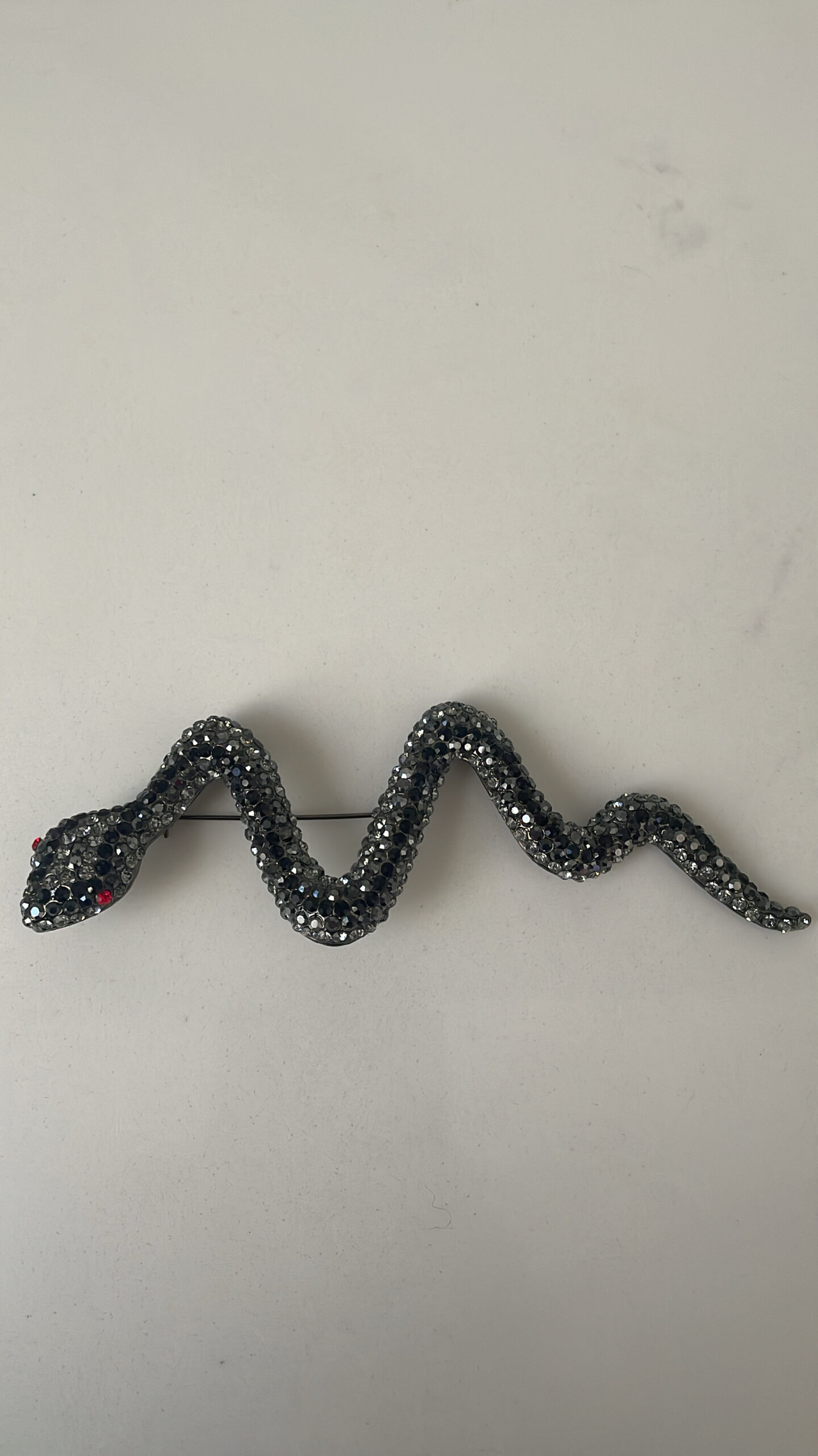 Artistic black & grey crystal snake brooch with red crystal eyes. Measures approximately 135mm long x 8mm wide. It has a rollover clasp (or locking c clasp) to ensure it is secure. Limited stock.