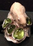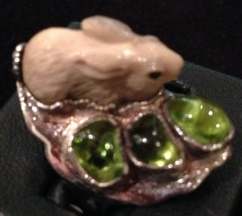 Extremely cute and unique silver bunny ring set with peridot and ancient ivory. This unique piece of jewellery includes ancient ivory either of walrus or mammoth buried in the snows of Alaska from between 5000 and 50000 years. The yearly melting of the snows and the minerals in the earth have given it its unique colour. It has been unearthed by Eskimos and hand carved. Hand made by American designer Steven Ruse. Approximate size US 7 UK O. Measures approximately 30mm long x 20mm wide. One only.
