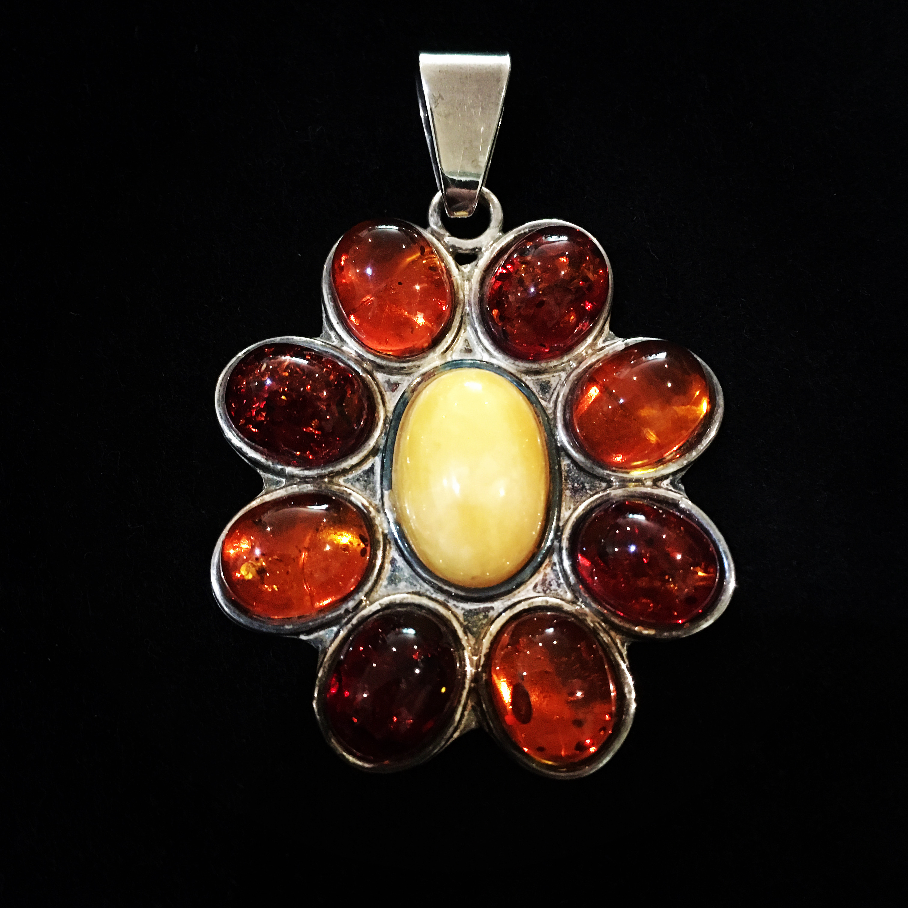 Unique Sterling silver flower pendant (stamped 925) set with amber, including a butter amber centre. Measures approximately 50mm (inclusive of bale) x 36mm width. One only.